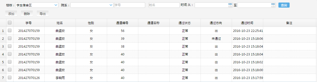 同步學生通道數據,記錄學生每天進出宿舍記錄,可以按照樓棟、院系、學號、姓名、時間段進行查詢