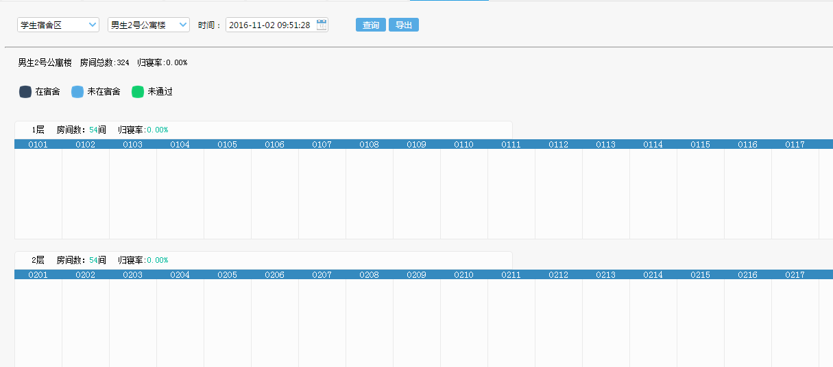 以宿舍平面圖的形式展示宿舍樓各個宿舍的歸寢情況,可以按照宿舍樓、時間進行查看