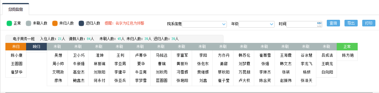 以院系、專業、班級為單位統計目標日期學生的歸寢情況,以班級為單位時,用不同的顏色展示不同的狀態,可視化的顯示學生歸寢情況,以院系、專業為單位時,查詢各個院系、班級各個狀態的學生數量