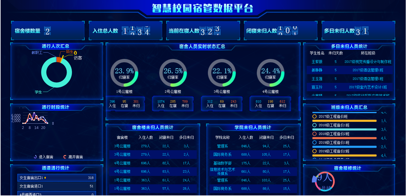 綜合分析系統提供大屏和移動端數據及實時監控展示方式,實時統計分析當前公寓的住宿人數、在寢人數、外出人數;支持視圖化查看當前公寓的在寢情況;支持各公寓樓的通道實時狀態,支持進行人流量統計,支持按時段統計人流量;支持學生異常狀態分析等。