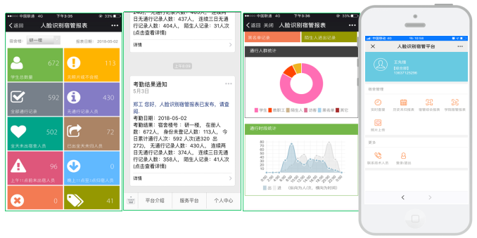校園解決方案基于人臉識別技術,有效解決原有系統刷卡、指紋方式問題,形成了高校公寓管理的一整套解決方案。該系統利用人臉識別技術實時甄別每個通過閘口進入到宿舍樓的人員,同時管理系統實時統計分析學生在寢時間、離寢時間、晚歸次數等各種狀況,并將報表推送給公寓管理中心、學生公寓、學生的輔導員教師進行相應處置,避免了每次大規模查寢所耗費的人力物力。